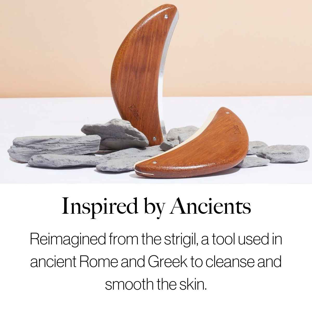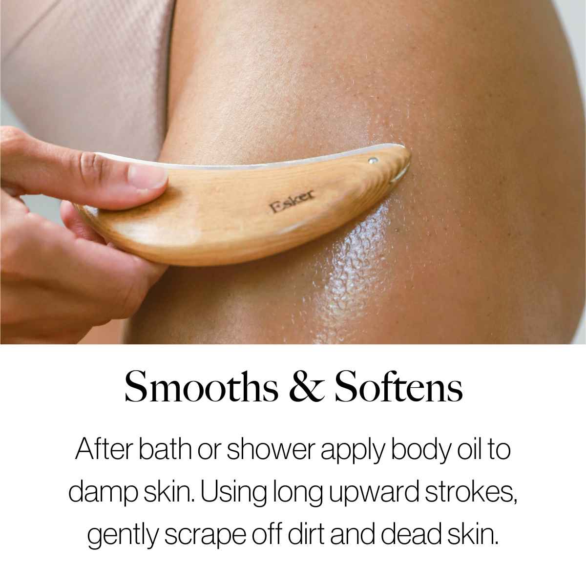 After bathing or showering, apply body oil while skin is still damp. Using long strokes glide the tool towards the heart. Wipe blade in between strokes and be amazed at what comes off.