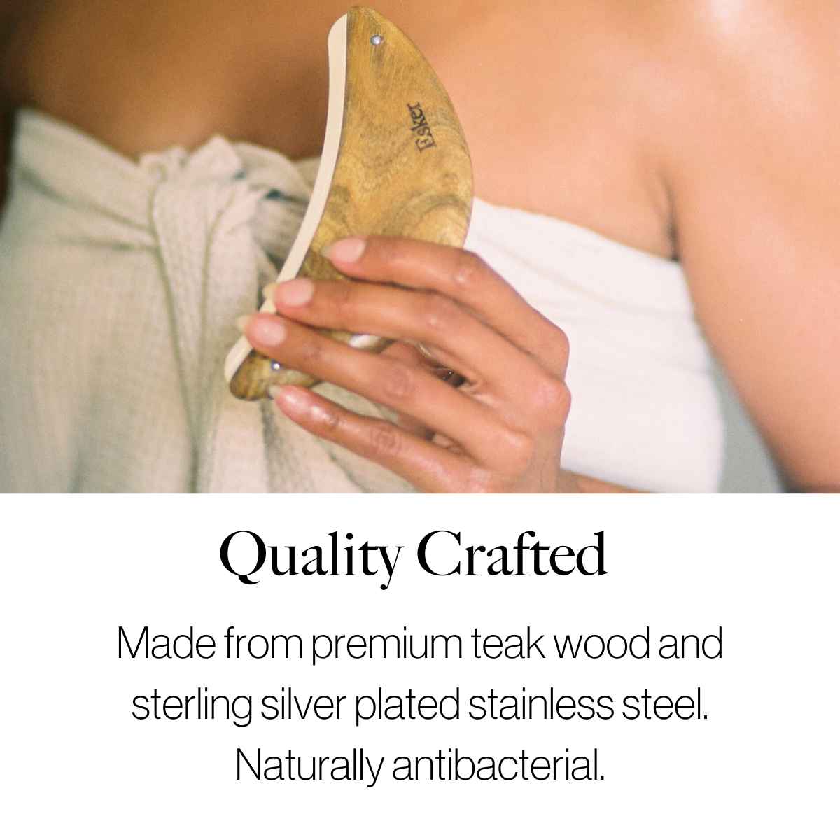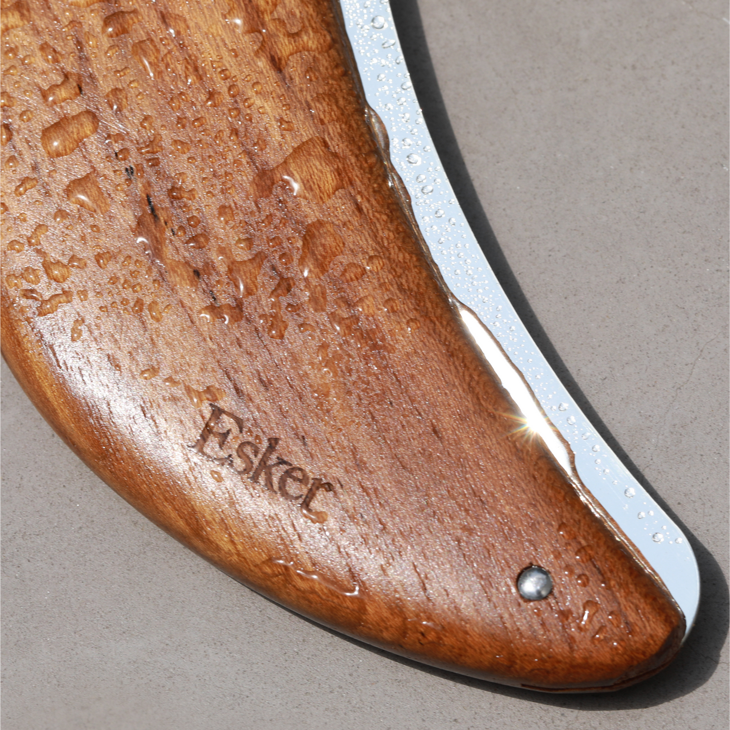Our patent-pending tool is made from solid teak wood and the blade is made from sterling silver plated stainless steel.