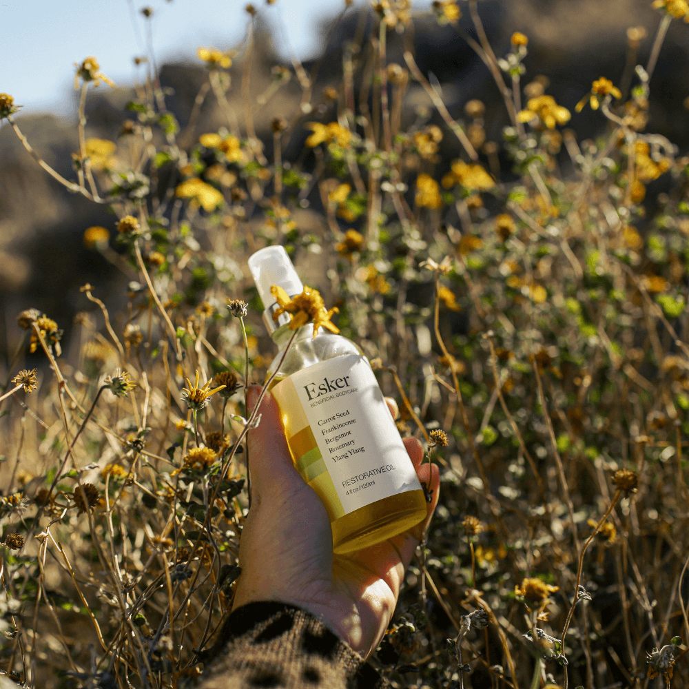 Esker was born right around the same time as Shannon's first little one, and she introduced the line with three custom-crafted body oil formulas aimed to celebrate the diversity and power of essential oils, and to function as a necessary step in any body care ritual. She pulled from a versatile range of plants to create a restorative, clarifying, and firming oil, each one carefully formulated with responsibly-sourced ingredients to nourish skin from head to toe.Â