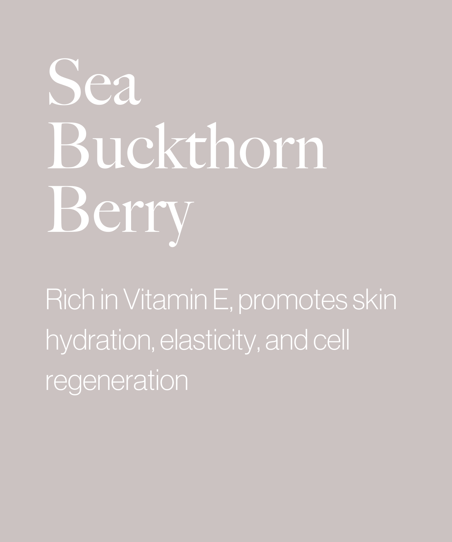 Sea Buckthorn Berry: Rich in Vitamin E, promotes skin hydration, elasticity, and cell regeneration