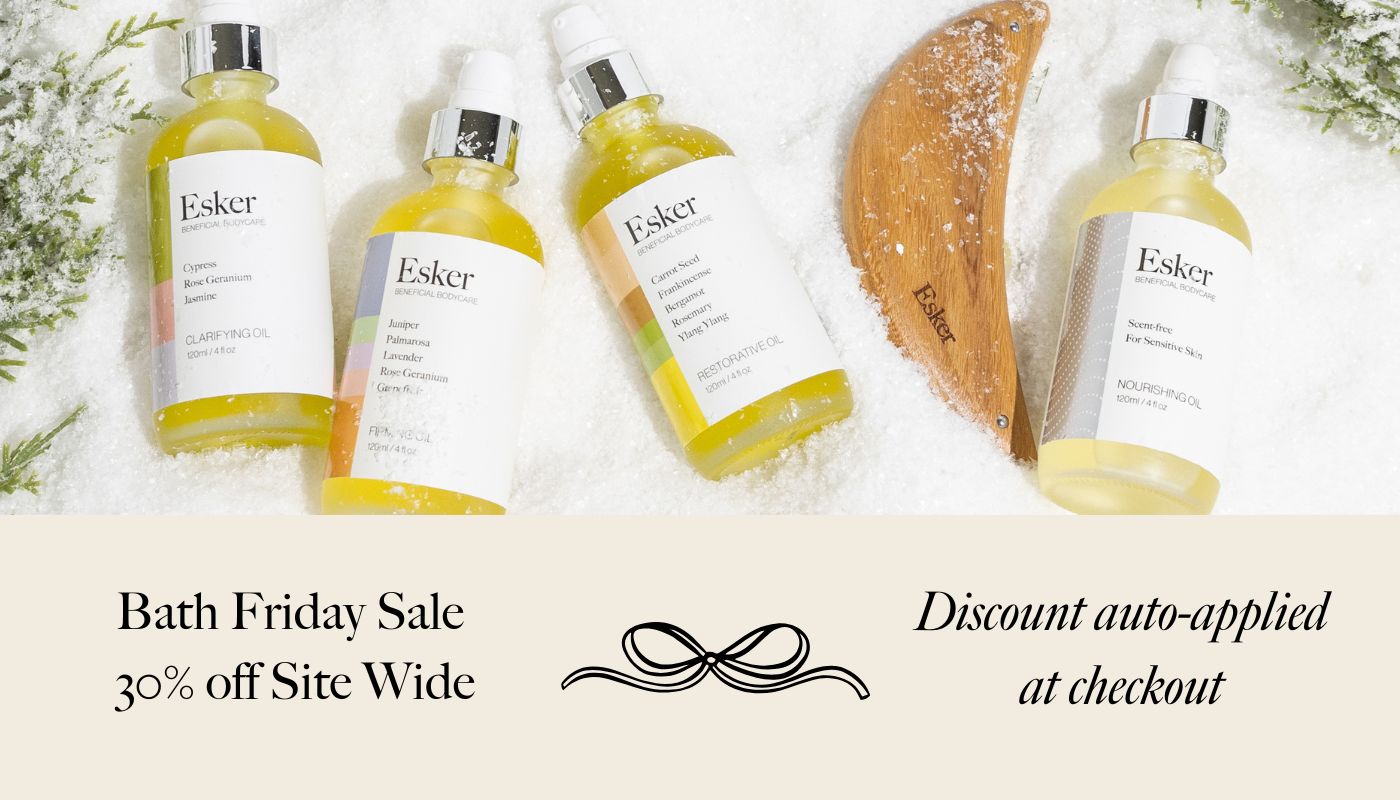 Following a deeply relaxing bath or shower, apply 2-3 pumps of your favorite Esker Body Oil, one limb at at time. Use long, gentle strokes and medium pressure. Spend extra time on each body part, with a deep appreciation for the skin you are in.
