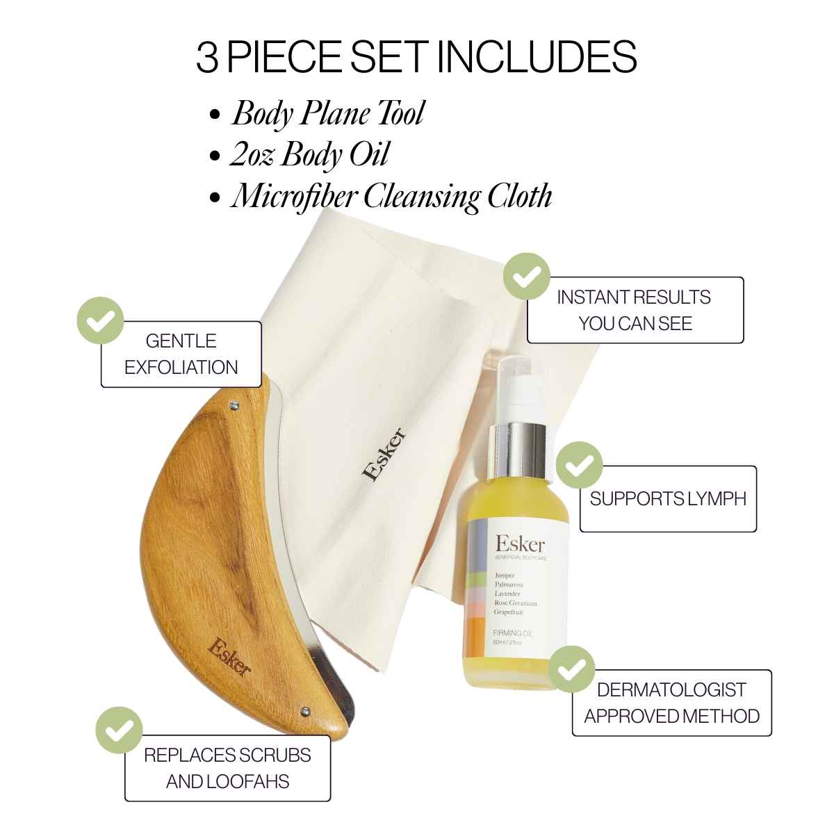 The Body Plane Set sweeps away buildup, lifts dead skin, boosts circulation, and leaves your skin incredibly smooth without redness or abrasion.
