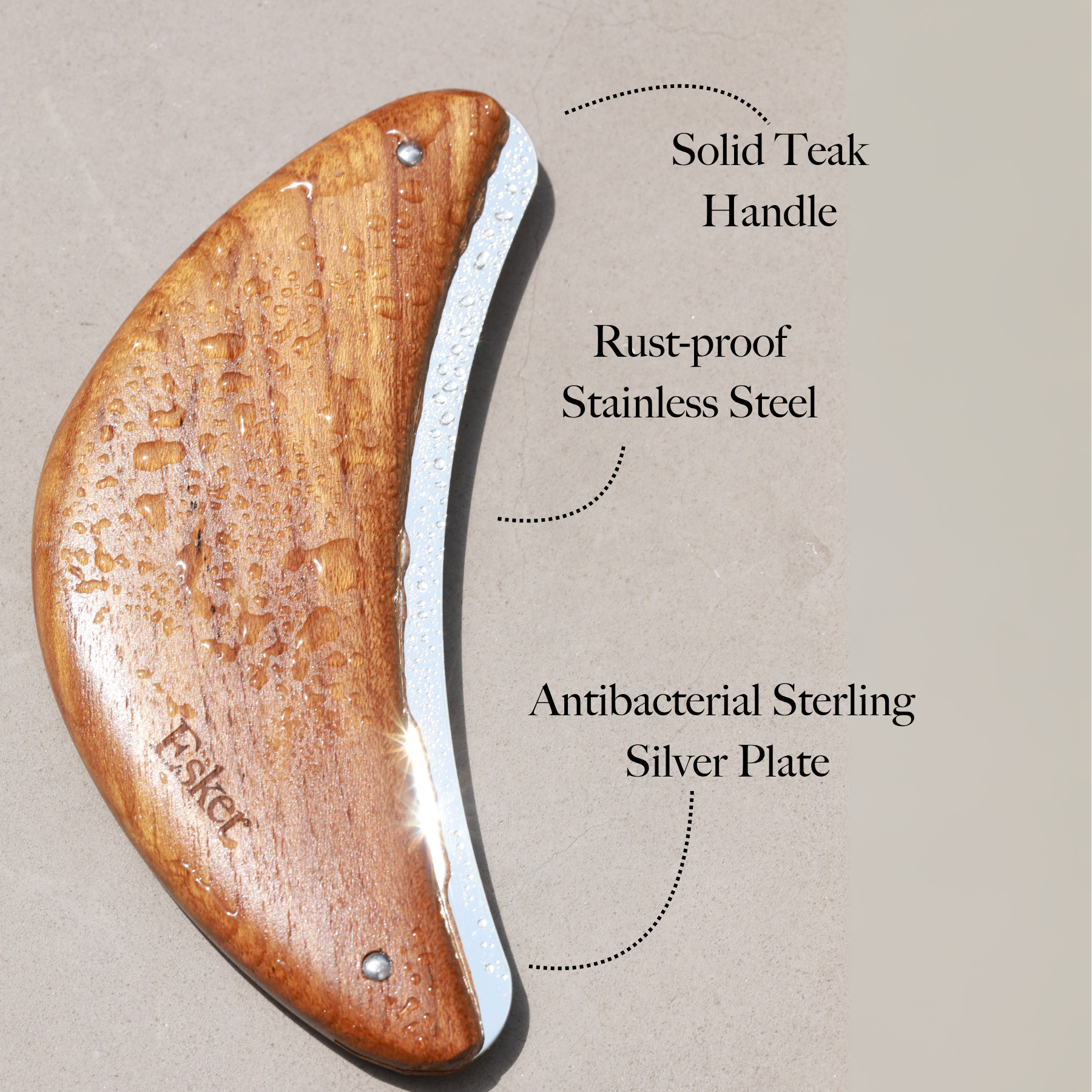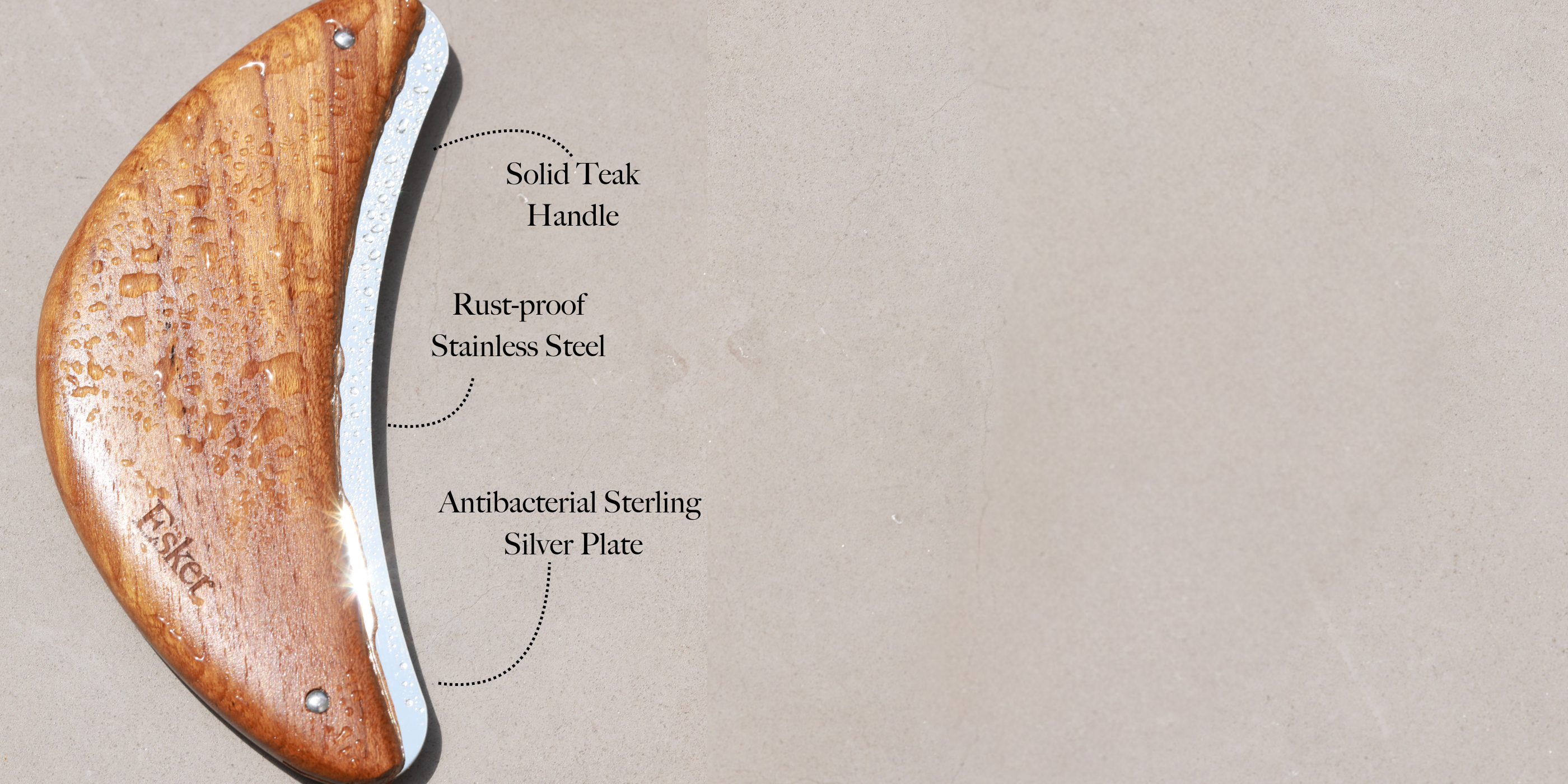 Patent-pending stainless steel tool that smooths bumps, ingrown hairs, and rough patches instantly. Inspired by ancient Greek strigil techniques, this modern approach reveals softer skin from the first use—designed to work with any body oil.
