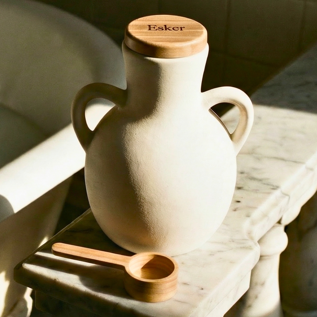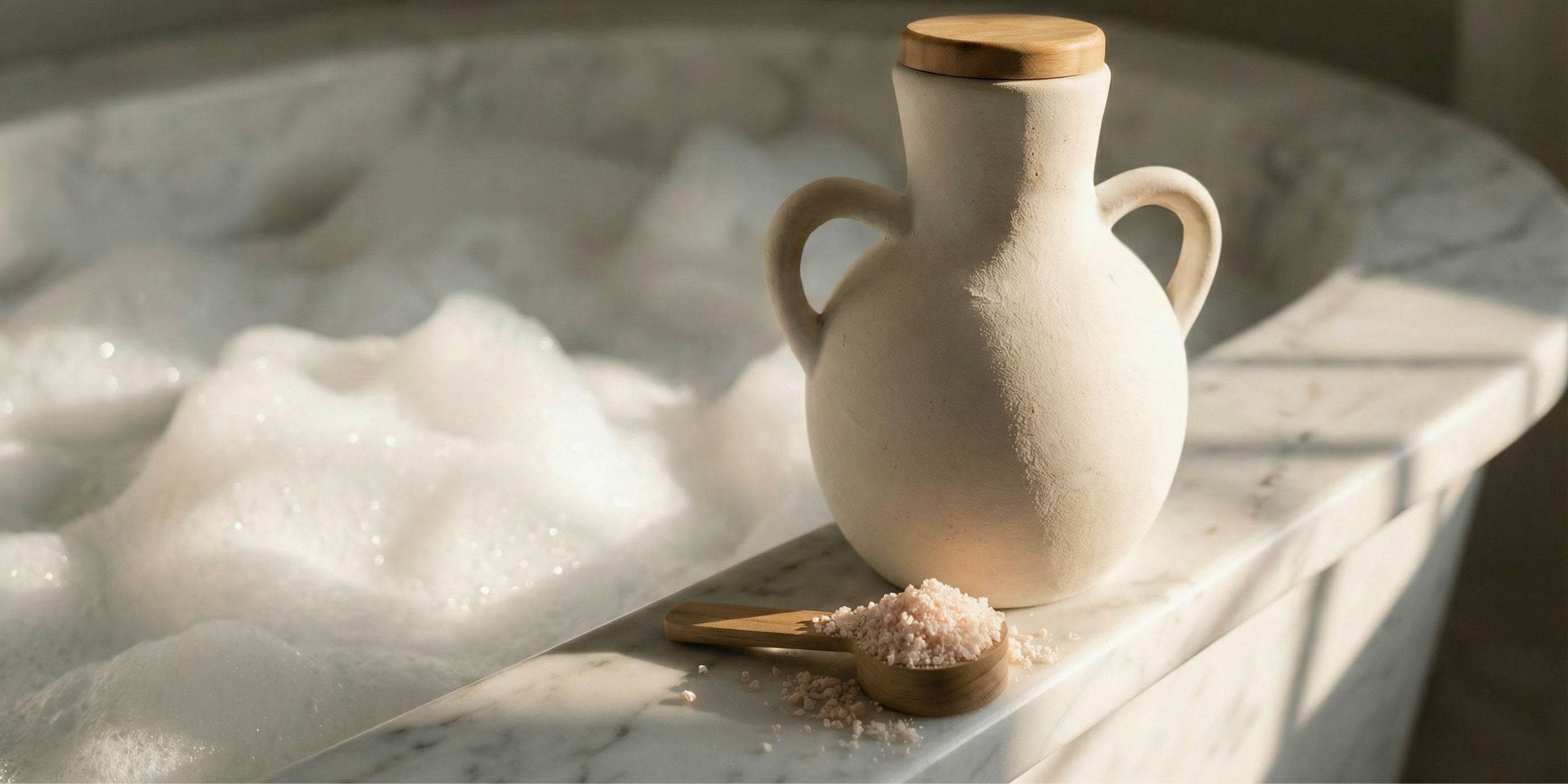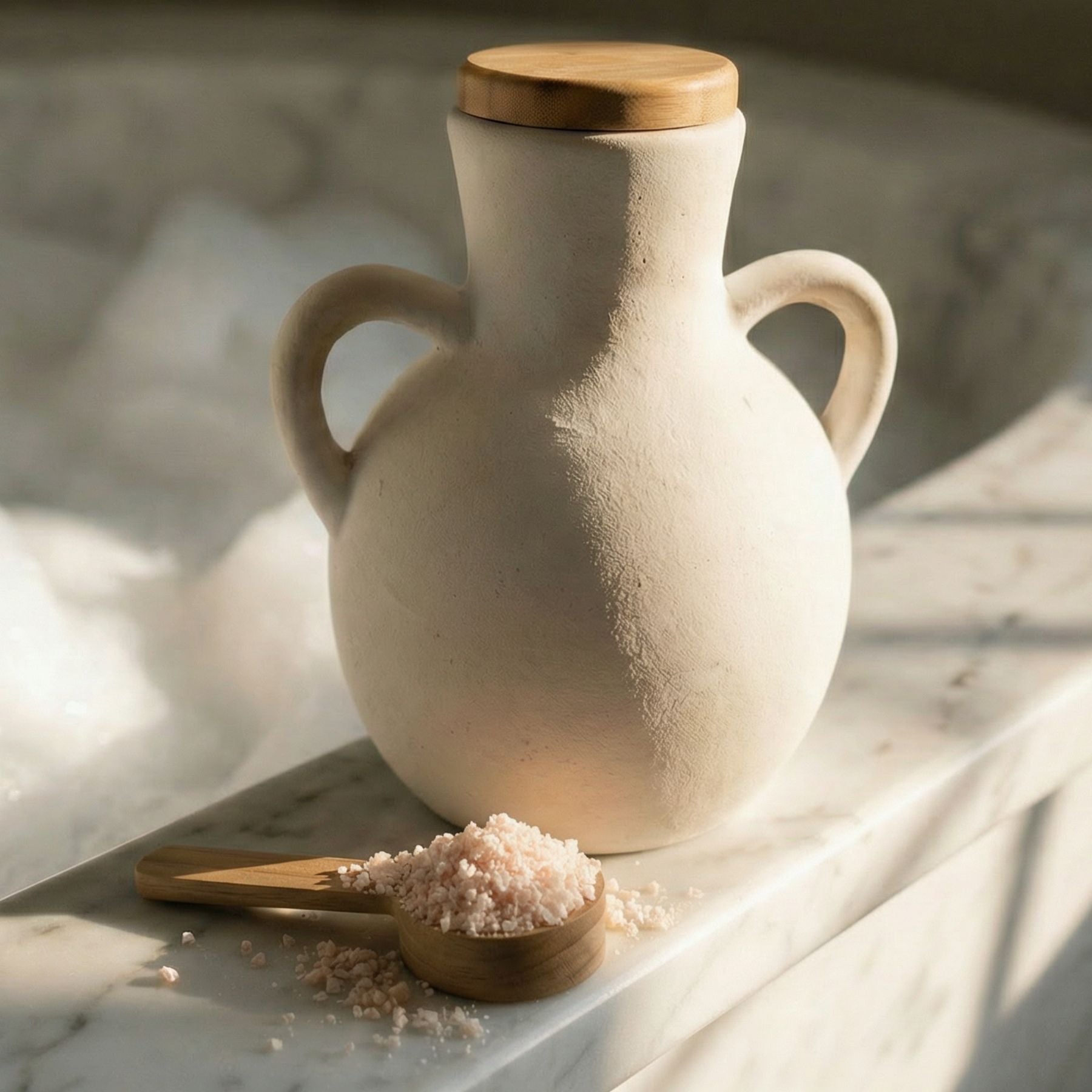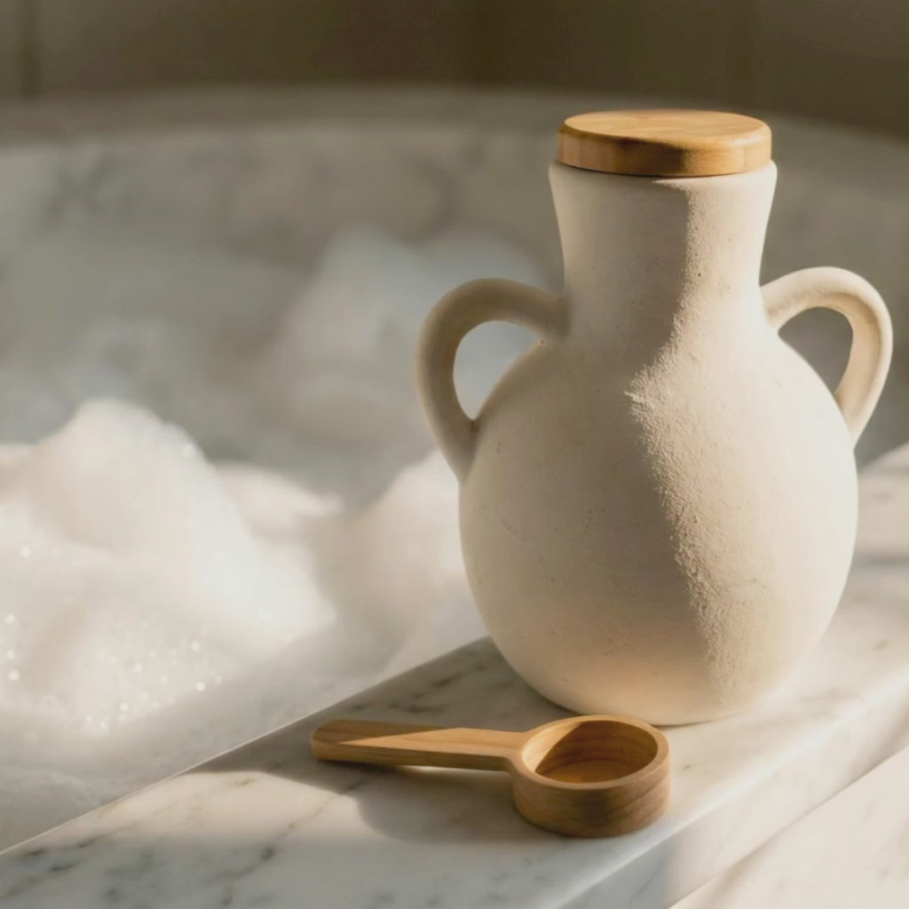 A mineral-rich, waterless bubble soak housed in a modern Greek amphora — for softer skin, deeper calm, and a bathroom that finally feels like a sanctuary.